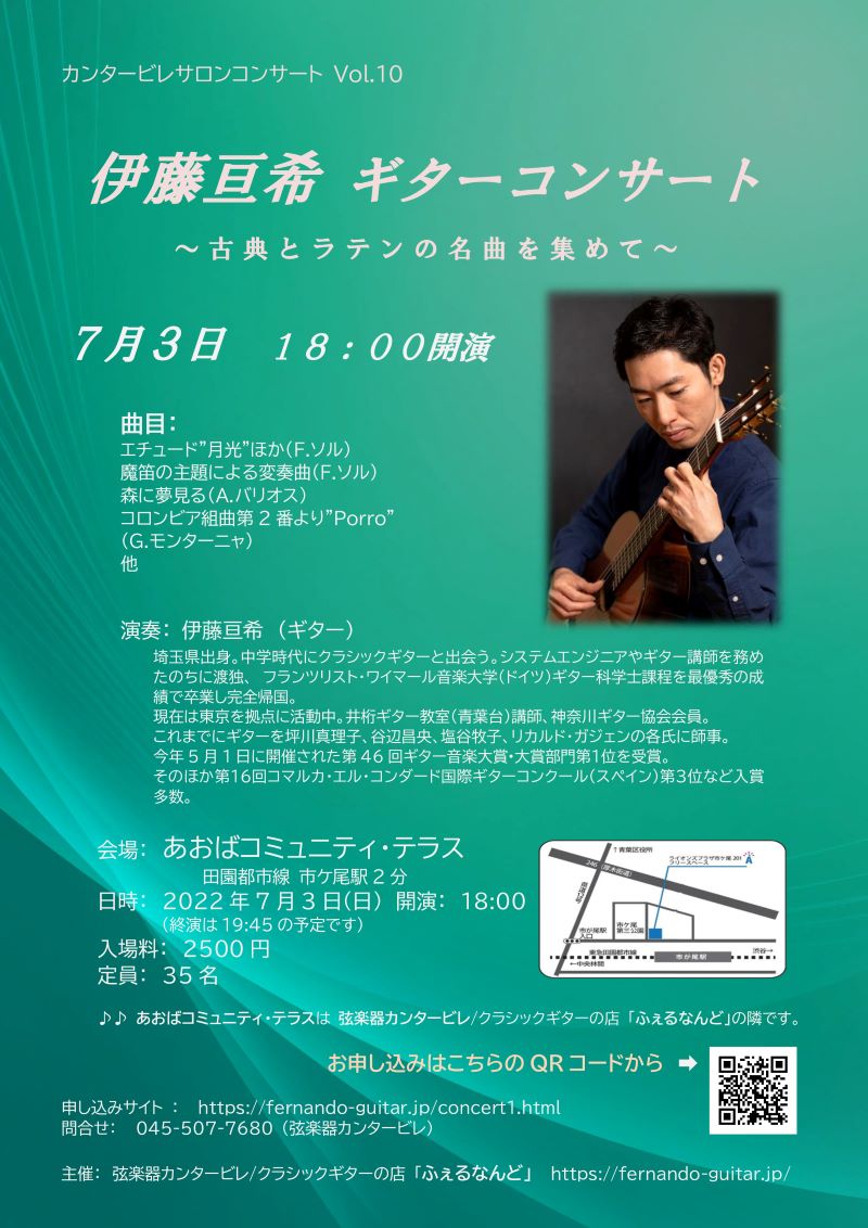 コロナ禍で店内でのコンサートの開催をあきらめてましたが、弦楽器カンタービレ/クラシックギターの店「ふぇるなんど」の隣のテナントで活動しているNPOの「あおばコミュニティテラス」のご厚意で会場を提供いただきました。「あおばコミュニティテラス」は、生のギターに最適な音響空間ですので、皆様お誘いあわせの上お越しください。