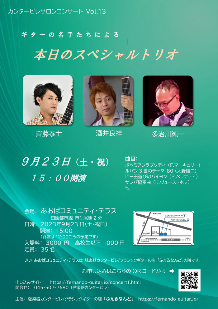 この企画は弦楽器カンタービレ/クラシックギターの店「ふぇるなんど」の隣のテナントで活動しているNPOの「あおばコミュニティテラス」のご厚意で会場を提供いただきました。「あおばコミュニティテラス」は、ギターのサロンコンサートに最適な音響空間ですので、皆様お誘いあわせの上お越しください。
